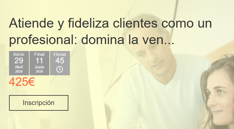 Más información e inscripciones:https://www.cevirtualhuesca.es/cursos/atiende-y-fideliza-clientes-como-un-profesional-domina-la-venta-y-la-posventa