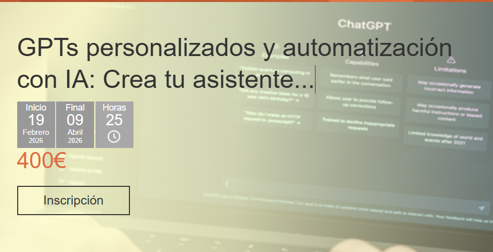 febrero, 2026 Ju19feb5:43 PMJu5:43 PMFormato OnlineCampus virtual: GPTs personalizados y automatización con IA: Crea tu asistente Detalles del evento Más información e inscripciones:https://www.cevirtualhuesca.es/cursos/gpts-personalizados-y-automatizacion-con-ia-crea-tu-asistente-inteligente-feb26 Consulta todos nuestros curso del Campus Virtual: Detalles del evento Más información e inscripciones:https://www.cevirtualhuesca.es/cursos/gpts-personalizados-y-automatizacion-con-ia-crea-tu-asistente-inteligente-feb26 Consulta todos nuestros curso del Campus Virtual: https://www.cevirtualhuesca.es/cursos/