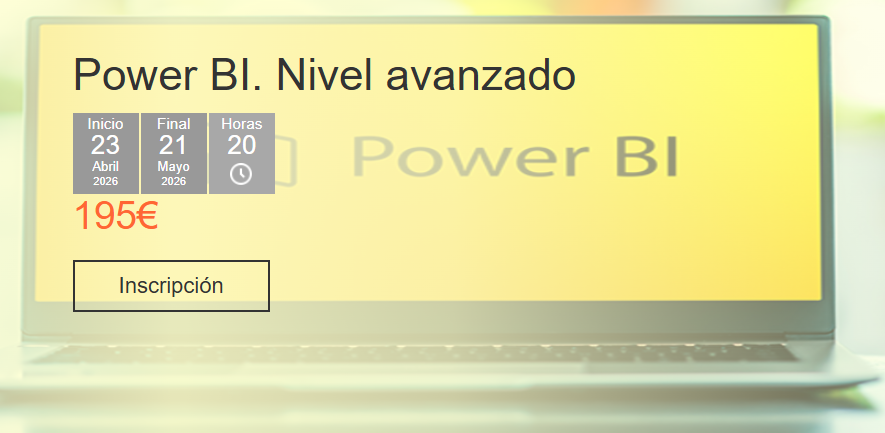 abril, 2026 Ju23abr1:19 PMJu1:19 PMFormato OnlineCampus virtual: Power BI. Nivel avanzado Detalles del evento Más información e inscripciones:https://www.cevirtualhuesca.es/cursos/power-bi-nivel-avanzado-23-04-2026 Consulta todos nuestros curso del Campus Virtual: https://www.cevirtualhuesca.es/cursos/ Detalles del evento Más información e inscripciones:https://www.cevirtualhuesca.es/cursos/power-bi-nivel-avanzado-23-04-2026 Consulta todos nuestros curso del Campus Virtual: https://www.cevirtualhuesca.es/cursos/ Bonificable