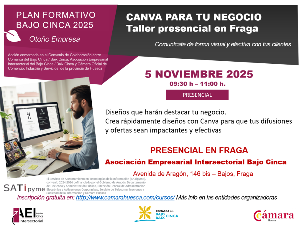 Acción financiada y enmarcada en el Convenio de Colaboración entre la Comarca de Bajo Cinca / Baix Cinca, Asociación Empresarial Intersectorial de Bajo Cinca y Cámara Huesca
