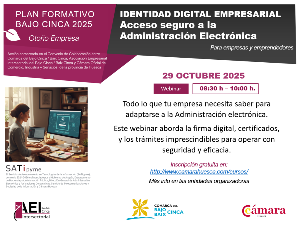 Acción financiada y enmarcada en el Convenio de Colaboración entre la Comarca de Bajo Cinca / Baix Cinca, Asociación Empresarial Intersectorial de Bajo Cinca y Cámara Huesca y cofinanciado por el Gobierno de Aragón, Departamento de Hacienda y Administración Pública, Dirección General de Administración Electrónica y Aplicaciones Corporativas, Servicio de Telecomunicaciones y Sociedad de la Información