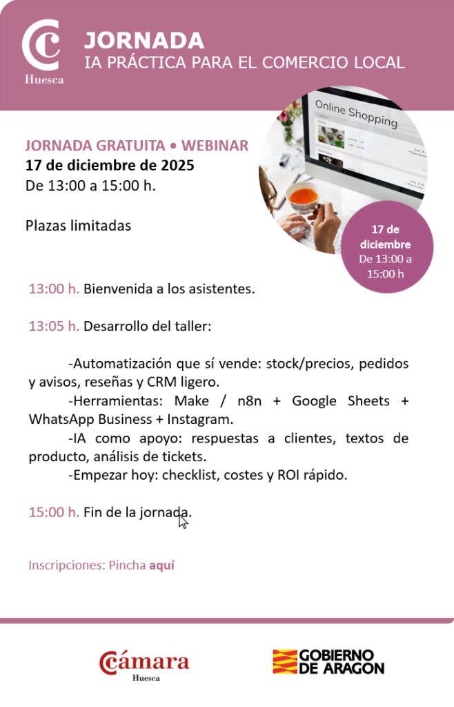 Mi17dic1:00 PMMi3:00 PMFormato OnlineJORNADA COMERCIO: IA PRÁCTICA PARA EL COMERCIO LOCALONLINEHorario:De 13:00 h a 15:00 h