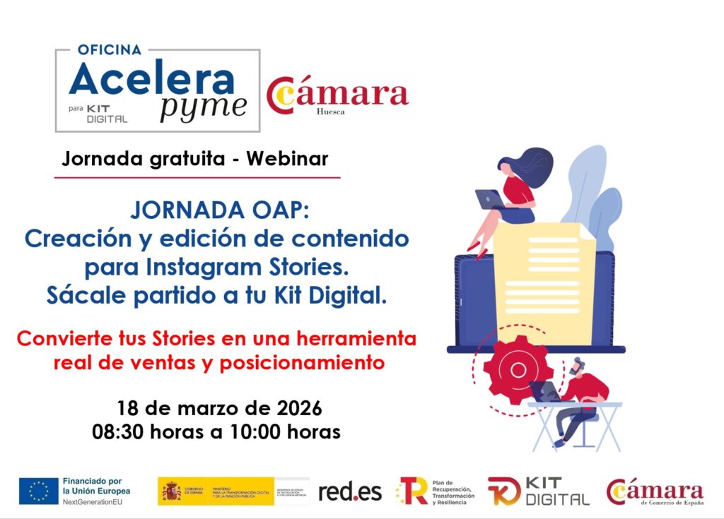 Marzo, 2026 Mi18mar8:30 AMMi10:00 AMFormato OnlineJORNADA OAP: Creación y edición de contenido para Instagram Stories. Sácale partido a tu Kit Digital.ONLINEHorario:De 8:30 h a 10:00 h Detalles del evento OBJETIVO: Convierte tus Stories en una herramienta real de ventas y posicionamiento Detalles del evento OBJETIVO: Convierte tus Stories en una herramienta real de ventas y posicionamiento AGENDA: 08:30: Bienvenida a los asistentes.08:35: Desarrollo del taller: Crear una estrategia efectivaTransforma tus Stories en contenido con intención. Editar y diseñar con impactoMejora tu estética visual con apps recomendadas y domina las herramientas internas. Maquetar Stories que enganchenOrganiza tus destacadas de forma profesional. Optimizar y analizar resultadosInterpreta estadísticas de forma inteligente. 10:00: Fin de la jornada. HorarioDe 8:30 h a 10:00 h LugarONLINE PrecioGratuito Número de Plazas150 Plazo fin de inscripción 18-03-2026 Ref. Curso2210 ColaboraFINANCIA: Cofinanciado por la Unión Europea, Fondos Next Generation EU y la entidad pública empresarial Red.es
