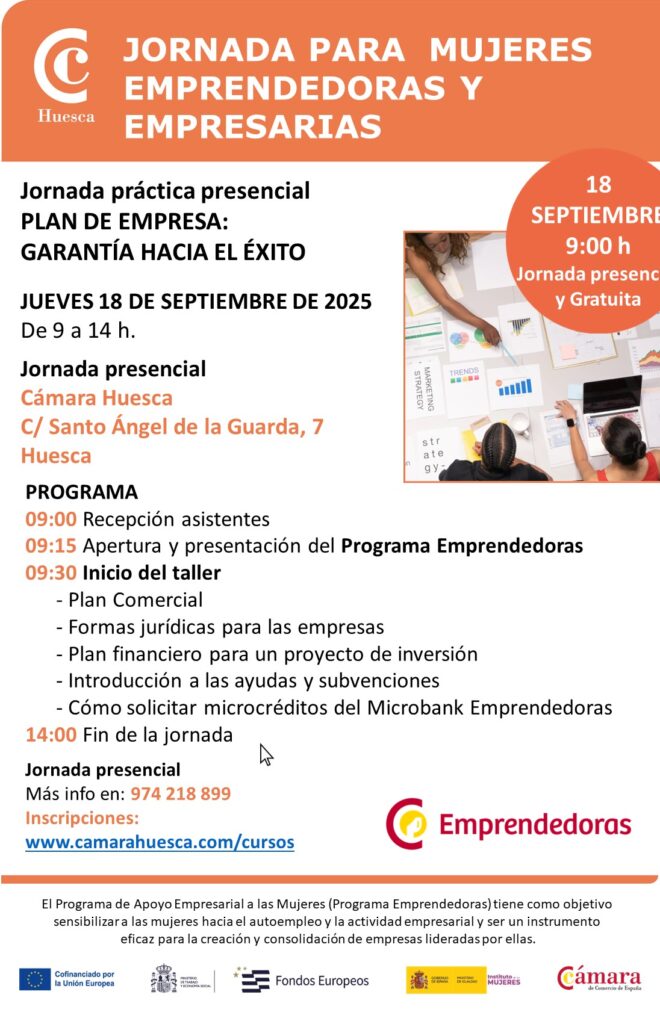 septiembre, 2025 Cámara de Comercio de HuescaCalle Santo Ángel de la Guarda, 7 22005 Huesca Ju18sep9:00 AMJu2:00 PMFormato PresencialJornada: Plan de empresa, garantía hacia el éxitoCámara de Comercio de Huesca, Calle Santo Ángel de la Guarda, 7 22005 HuescaHorario:De 9 h a 14 h Detalles del evento Detalles del evento HorarioDe 9 h a 14 h LugarCámara de Comercio de HuescaCalle Santo Ángel de la Guarda, 7 22005 Huesca PrecioGratuito Número de Plazas26 Plazo fin de inscripción 18-09-2025 Ref. Curso2122