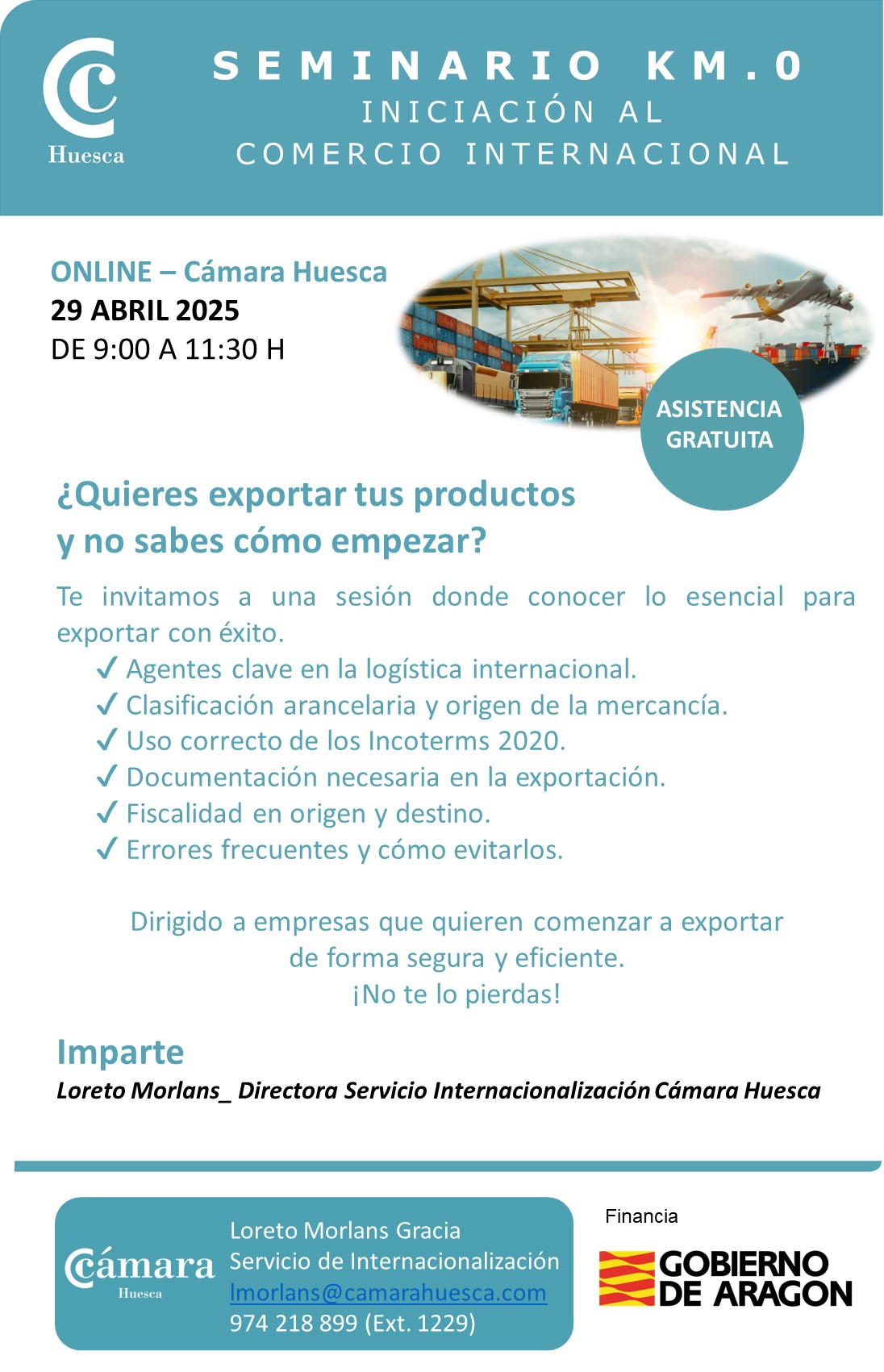 abril, 2025 Ma29abr9:00 AMMa11:30 AMFormato OnlineSeminario km 0: Iniciación al comercio internacionalHorario:De 9 h a 11:30 h HorarioDe 9 h a 11:30 h PrecioGratuito Número de Plazas100 Plazo fin de inscripción 29-04-2025 Ref. Curso2078