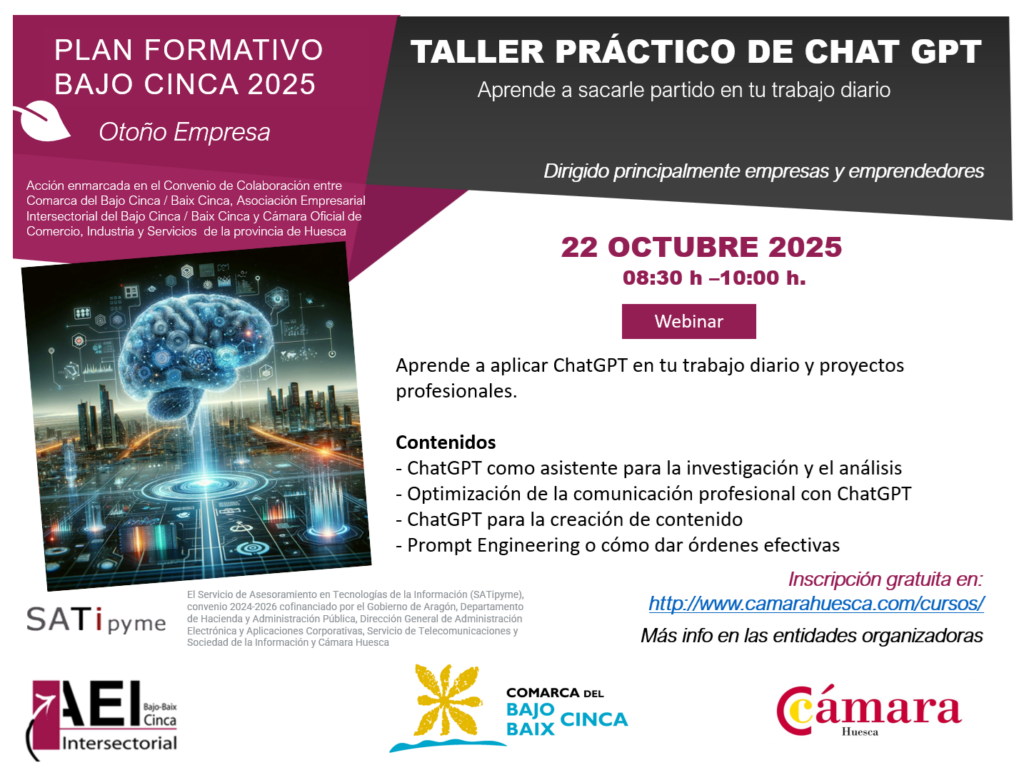 Acción financiada y enmarcada en el Convenio de Colaboración entre la Comarca de Bajo Cinca / Baix Cinca, Asociación Empresarial Intersectorial de Bajo Cinca y Cámara Huesca y cofinanciado por el Gobierno de Aragón, Departamento de Hacienda y Administración Pública, Dirección General de Administración Electrónica y Aplicaciones Corporativas, Servicio de Telecomunicaciones y Sociedad de la Información