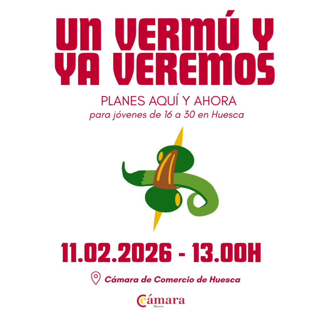 febrero, 2026 Cámara Oficial de Comercio, Industria y Servicios de la Provincia de HuescaSanto Ángel de la Guarda, 7, 22005 Huesca Mi11feb1:00 PMMi2:00 PMFormato PresencialUN VERMÚ Y YA VEREMOSCámara Oficial de Comercio, Industria y Servicios de la Provincia de Huesca, Santo Ángel de la Guarda, 7, 22005 HuescaHorario:De 13:00 h a 14:00 h Detalles del evento ¿Qué te vas a encontrar? Detalles del evento ¿Qué te vas a encontrar? Información clara sobre oportunidades reales de empleo. Un espacio cercano para preguntar, escuchar y valorar opciones, sin compromiso. Posibilidad de viajar a por europa gratis. Tres caminos reales para avanzar 1️⃣ Crea tu proyectoDescubre cómo poner en marcha una idea propia y qué apoyos existen para empezar. 2️⃣ Formación de alta empleabilidadConoce cursos y formaciones prácticas pensadas para encontrar trabajo de verdad. 3️⃣ Conecta con empresas y jóvenes como túEspacios para conocer empresas, compartir experiencias y ampliar contactos HorarioDe 13:00 h a 14:00 h LugarCámara Oficial de Comercio, Industria y Servicios de la Provincia de HuescaSanto Ángel de la Guarda, 7, 22005 Huesca PrecioGratuito Número de Plazas50 Plazo fin de inscripción 10-02-2026 Ref. Curso2194