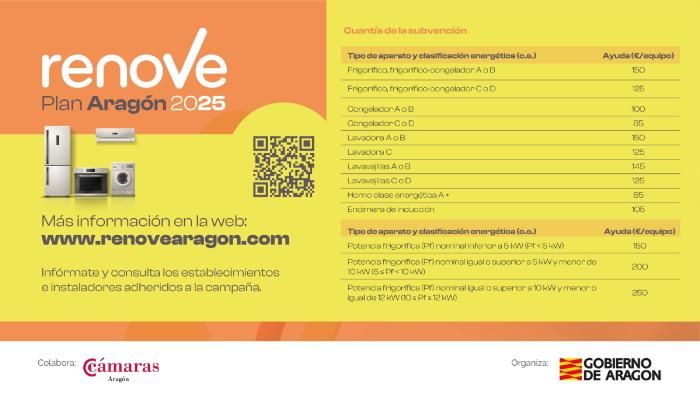 Las ayudas, que varían dependiendo del electrodoméstico y su eficiencia, van desde los 85 a los 250 euros y podrán ser adquiridos solo en las tiendas físicas adheridas al programa que podrán ser consultadas en la web https://renovearagon.com/. El plan estará disponible en los tres meses posteriores a la convocatoria o hasta que finalicen los fondos.