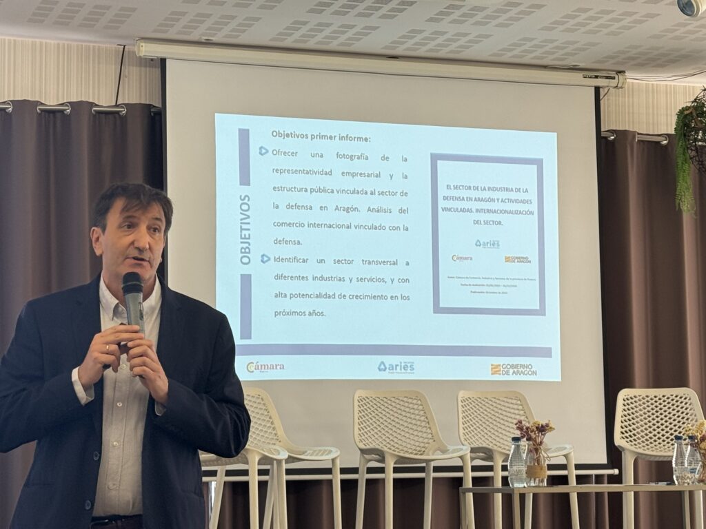 El desayuno empresarial organizado por AMEPHU en Monzón, la Asociación de Empresarios Monzón y Cinca Medio y la Diputación Provincial de Huesca, en colaboración con la Cámara de Comercio a través del programa Aries, ha puesto de relieve las oportunidades que ofrece el sector Defensa como motor de desarrollo económico y tecnológico en Aragón. Durante el encuentro, Jorge Gómez presentó el Estudio del sector Defensa en Aragón, elaborado en el marco del programa Aries, Aragón Impulso de Empresas, coordinado por la Dirección General de Promoción Industrial e Innovación del Gobierno de Aragón y ejecutado en la provincia de Huesca por la Cámara de Comercio de Huesca.