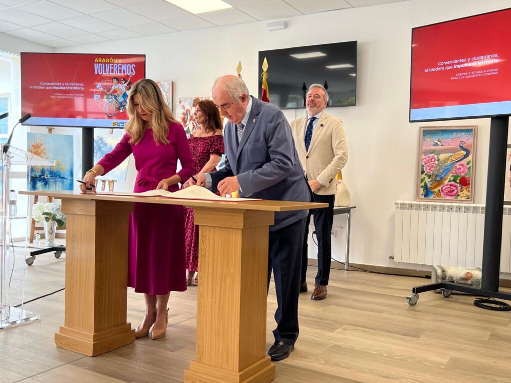 En el acto de presentación, la vicepresidenta y consejera de Presidencia, Economía y Justicia, Mar Vaquero, y el presidente del Consejo Aragonés de Cámaras, Manuel Rodríguez, han firmado el correspondiente acuerdo para la gestión del programa Volveremos. Además, han participado la alcaldesa de Ejea de los Caballeros, Teresa Ladrero, y la directora general de Comercio, Ferias y Artesanía, Carmen Herrarte.