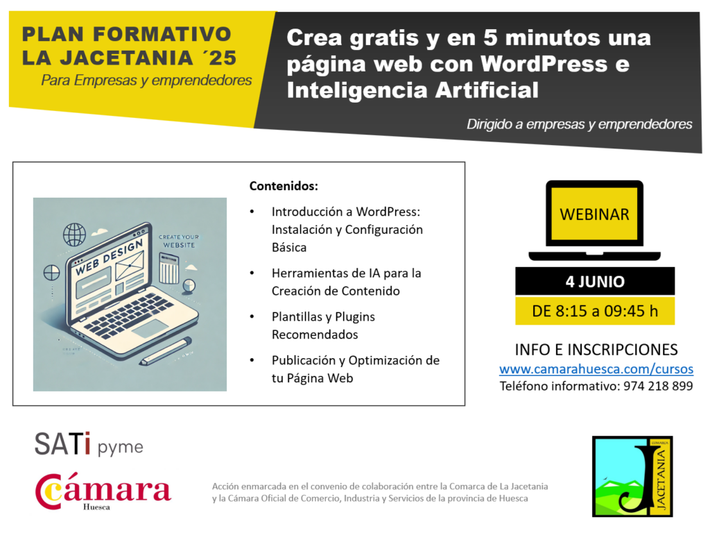 Acción enmarcada en el convenio de colaboración entre la Comarca de La Jacetania y la Cámara Oficial de Comercio, Industria y Servicios de la provincia de Huesca. Este servicio está cofinanciado por el Gobierno de Aragón, Departamento de Hacienda y Administración Pública, Dirección General de Administración Electrónica y Aplicaciones Corporativas, Servicio de Telecomunicaciones y Sociedad de la Información