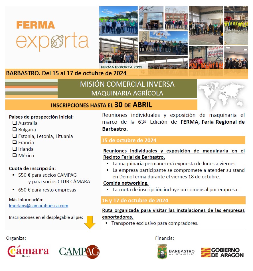 Tras el éxito de la edición anterior, e incluido en el Plan Cameral de Internacionalización del Gobierno de Aragón, la Cámara de Huesca, con la colaboración del Cluster Aragonés de Medios de Producción Agrícola y Ganadero, organiza esta misión comercial inversa de maquinaria agrícola, con el objetivo de concertar reuniones individuales entre los importadores invitados y las empresas aragonesas.