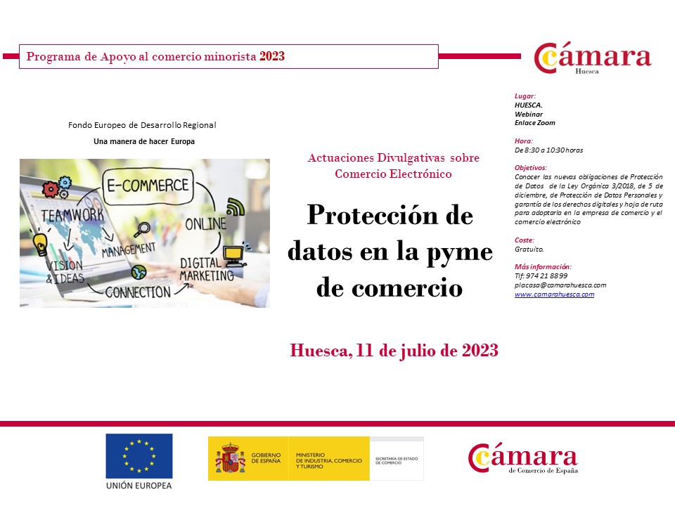julio, 2023 Ma11jul8:30 AMMa10:30 AMFormato OnlineJornada divulgativa: Protección de datos en la Pyme de comercioHorario:De 8:30 h a 10:30 h Detalles del evento Detalles del evento HorarioDe 8:30 h a 10:30 h PrecioGratuito Número de Plazas100 Plazo fin de inscripción 12-07-2023 Ref. Curso1757