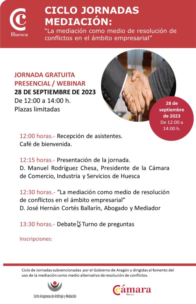 En el marco de los proyectos subvencionados por el Gobierno de Aragón dirigidos al fomento del uso de la mediación como medio alternativo de resolución de conflictos, la Corte Aragonesa de Arbitraje y Mediación organiza durante el mes de septiembre un ciclo de jornadas con el objetivo de difundir, divulgar y promocionar la mediación como como fórmula alternativa de solución de conflictos que puedan surgir entre personas físicas y/o empresas, así como para ofrecer al público interesado los servicios de mediación y arbitraje de la Corte Aragonesa de Arbitraje y Mediación.