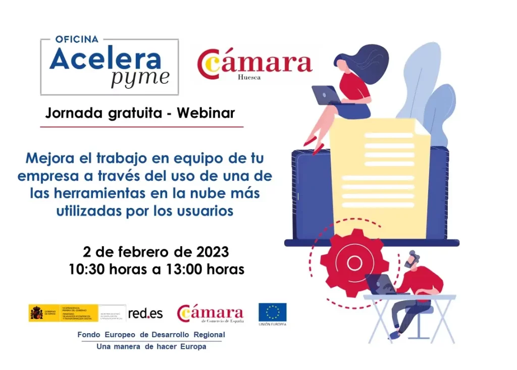 febrero, 2023 Cámara Oficial de Comercio, Industria y Servicios de la Provincia de HuescaSanto Ángel de la Guarda, 7, 22005 Huesca Ju02feb10:30 AMJu12:00 AMFormato OnlineJORNADA OAP: Mejora el trabajo en equipo de tu empresa a través del uso de una de las herramientas en la nube más utilizadas por los usuarios.Cámara Oficial de Comercio, Industria y Servicios de la Provincia de Huesca, Santo Ángel de la Guarda, 7, 22005 HuescaHorario:10:30 horas a 13:00 horas Detalles del evento Agenda 10:30 Bienvenida a los asistentes 10:35 Contenidos: •Creación Detalles del evento Agenda 10:30 Bienvenida a los asistentes 10:35 Contenidos: •Creación y configuración de cuentas de Google. •Google Drive: Mi unidad. •Crear y eliminar carpetas. •Subir archivos y carpetas. •Crear y editar documentos de texto, hojas de cálculo, presentaciones y formularios con Google Drive. •Compartir y publicar archivos y carpetas. •Tareas y sugerencias. •Descargar documentos en otros formatos. 12:50 Conclusiones y Resolución de dudas a los participantes 13:00 Fin de la jornada Horario10:30 horas a 13:00 horas LugarCámara Oficial de Comercio, Industria y Servicios de la Provincia de HuescaSanto Ángel de la Guarda, 7, 22005 Huesca PrecioGratuito Número de Plazas99 Plazo fin de inscripción 01-02-2023 Ref. Curso1698 ColaboraFINANCIA: Fondo Europeo de Desarrollo Regional – Una manera de hacer Europa – Red.es – Cámara de España
