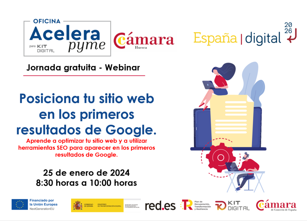 Enero, 2024 Ju25ene8:00 AMJu10:00 AMFormato OnlineJORNADA OAP: Posiciona tu sitio web en los primeros resultados de Google.ONLINEHorario:De 8:30 h a 10:00 h Detalles del evento AGENDA:08:30 Bienvenida a los asistentes08:35 Desarrollo de la jornada: Detalles del evento AGENDA:08:30 Bienvenida a los asistentes08:35 Desarrollo de la jornada: Introducción al SEO en 2024: Conoce los fundamentos del posicionamiento web en Google. Investigación de palabras clave: Descubre cómo encontrar las palabras clave adecuadas para tu sitio web. Optimización de contenido: Aprende a crear contenido relevante y valioso para tus visitantes y Google. Técnicas avanzadas de SEO: Descubre estrategias y herramientas avanzadas para mejorar tu posicionamiento en Google. 10:00 Fin de la Jornada HorarioDe 8:30 h a 10:00 h LugarONLINE PrecioGratuito Número de Plazas100 Plazo fin de inscripción 24-01-2024 Ref. Curso1849 ColaboraFINANCIA: Cofinanciado por la Unión Europea, Fondos Next Generation EU y la entidad pública empresarial Red.es