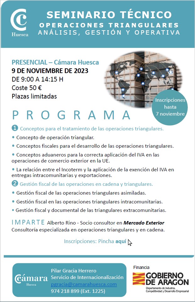 noviembre, 2023 Cámara de Comercio, Industria y Servicios de la Provincia de HuescaCalle Santo Ángel de la Guarda, 7 Ju09nov9:00 AMJu2:15 PMFormato PresencialSeminario técnico: Operaciones triangulares: análisis, gestión y operativaCámara de Comercio, Industria y Servicios de la Provincia de Huesca, Calle Santo Ángel de la Guarda, 7Horario:De 9 h a 14:15 h Detalles del evento Detalles del evento HorarioDe 9 h a 14:15 h LugarCámara de Comercio, Industria y Servicios de la Provincia de HuescaCalle Santo Ángel de la Guarda, 7 Precio50 euros Número de Plazas20 Plazo fin de inscripción 08-11-2023 Ref. Curso1818