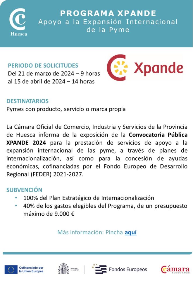 La Cámara de Comercio, Industria y Servicios de la provincia de Huesca abre desde el 21 de marzo hasta el 15 de abril el plazo de presentación de solicitudes de empresas interesadas en participar en el programa Xpande 2024 “Apoyo a la expansión internacional de la pyme”.