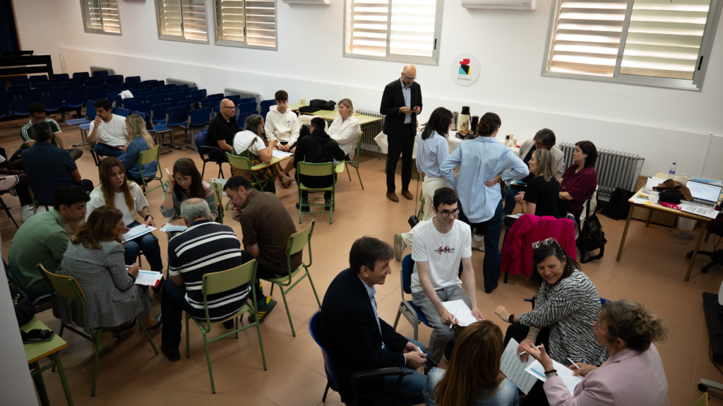 La iniciativa se desarrolla en 4 fases. Un primer paso fue el envío de un cuestionario a empresas de Huesca y profesorado de FP de la zona para obtener un primer estado de la cuestión en relación con los retos existentes en este entorno. El segundo hito fue un focus group con ocho jóvenes estudiantes de centros educativos de Monzón celebrado ayer lunes 27 de abril y que tuvo lugar en IES Mor de Fuentes. La sesión permitió compartir los retos, ampliarlos, priorizarlos y pensar propuestas desde la perspectiva de los jóvenes. La siguiente etapa ha tenido lugar hoy con una jornada que ha reunido un total de 30 personas entre alumnado, representantes de empresas y profesorado para elaborar propuestas a los retos, valorar su viabilidad y apuntar posibles soluciones a los mismos.