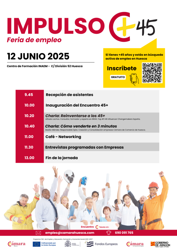 La Cámara de Comercio de Huesca y el Instituto Aragonés de Empleo organizan Impulso 45+, una feria de empleo especialmente diseñada para personas de entre 45 y 60 años que buscan trabajo o quieren reinventarse profesionalmente. Esta iniciativa tiene como objetivo facilitar encuentros directos entre los participantes y empresas que tienen necesidades de contratación y procesos de selección abiertos.